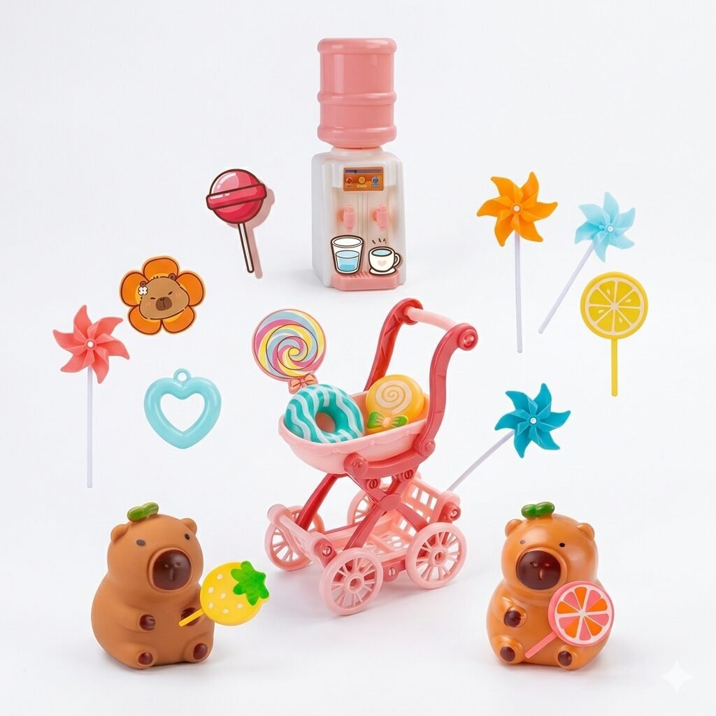 (312-6)-Aventura de Dulces con Capibara: ¡Carrito de Paseo y Bebedero!