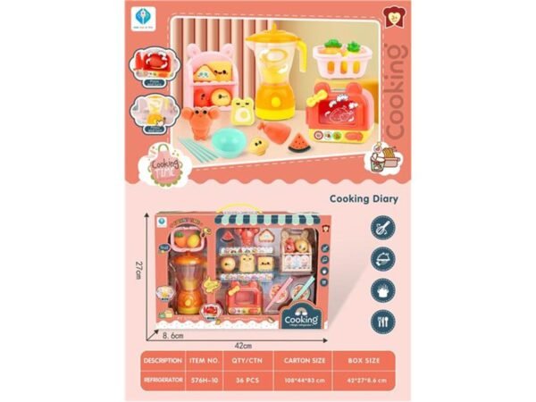 El set de cocina Cooking Diary 576H-10 incluye una licuadora, horno y alimentos de juguete en un práctico maletín portátil. Ideal para pequeños que aman imitar a los adultos y jugar a preparar comidas deliciosas.