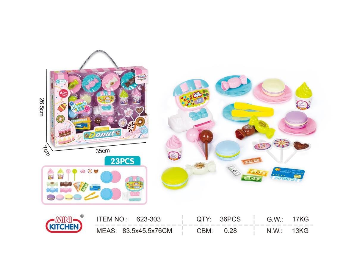 🎯 Incluye: 23 piezas (donas, dulces, helados, platos, pinzas, dinero y caja registradora)