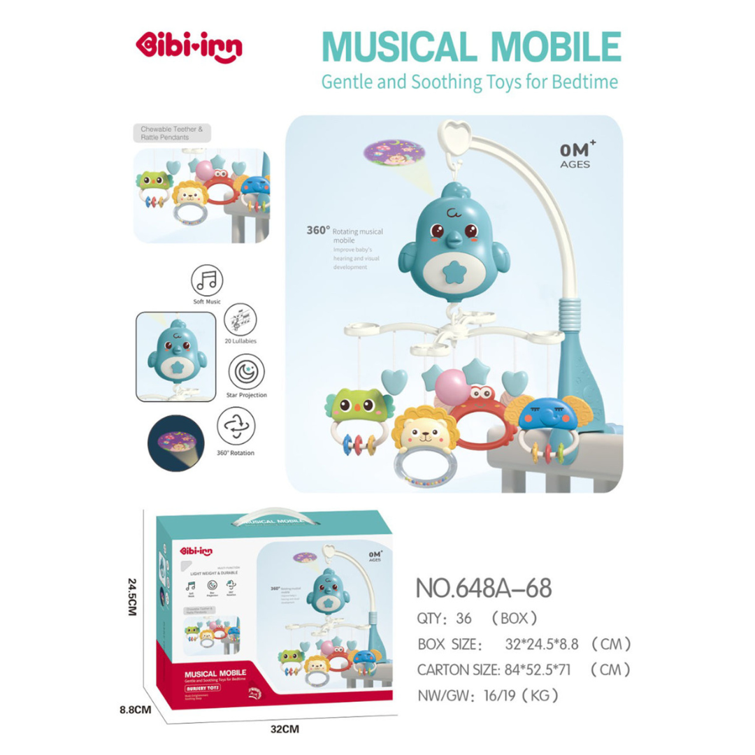 El Modelo 648A-68 / 648A-69 es un móvil musical premium con proyección de estrellas, giro de 360°, melodías suaves y sonajeros mordederas. Diseñado especialmente para ayudar al bebé a relajarse y conciliar el sueño de forma natural.