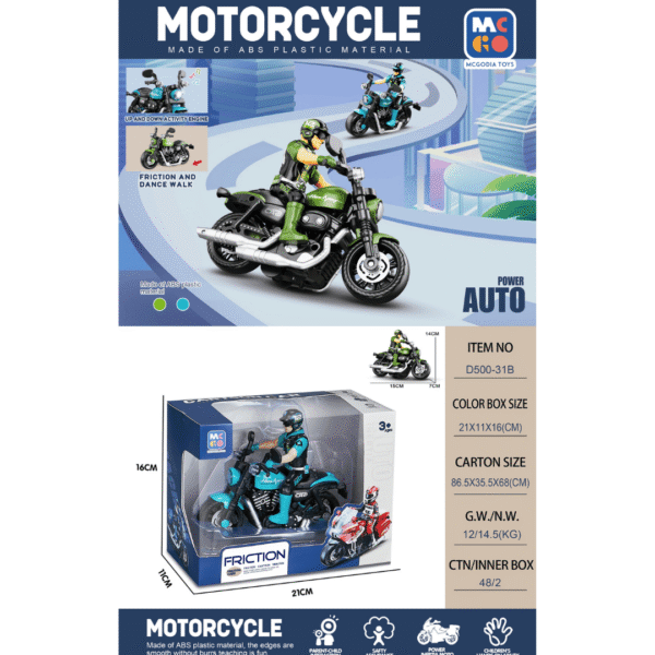 ¡Velocidad, acción y estilo en una sola moto! La motocicleta Power Auto es el juguete perfecto para los niños que aman la aventura. Con su sistema de fricción, luces, sonidos y figura de conductor, ofrece una experiencia de juego dinámica y realista.