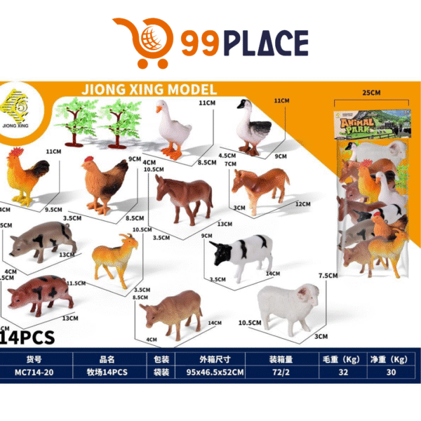El Set de Animales de Granja Jiong Xing – Modelo MC714-20 incluye 14 figuras detalladas de animales domésticos, perfectas para fomentar el juego imaginativo y el aprendizaje sobre la naturaleza y los animales del campo.