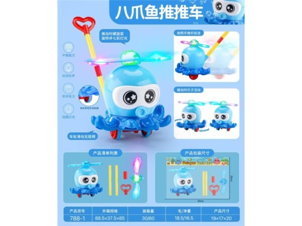 El Octopus Push Cart 788-1 es un adorable juguete empujable con forma de pulpo que combina luces de colores, movimiento y sonido para estimular la imaginación y el desarrollo motor de los más pequeños. Su diseño simpático y colores vibrantes hacen que cada paseo sea una experiencia llena de alegría.