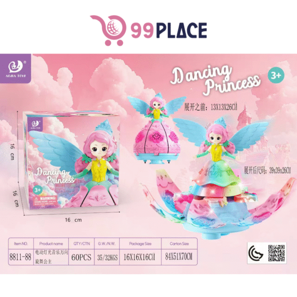 • Diseño de princesa mágica con alas desplegables que giran al ritmo de la música.