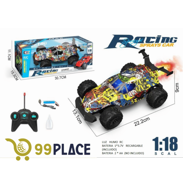 El Racing Sprays Car 1:18 es un auto RC con diseño grafiti moderno y potente sistema de vaporización trasera que simula humo real. Su estructura robusta y sus ruedas todoterreno lo convierten en la opción ideal para quienes buscan acción y estilo en cada carrera.