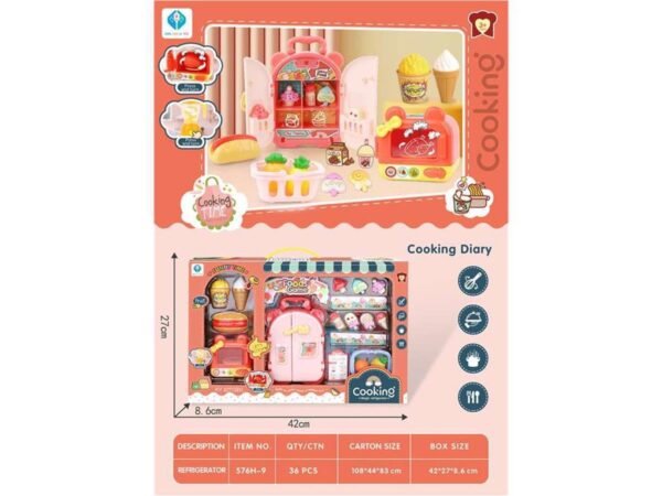 El set de cocina Cooking Diary incluye un refrigerador, horno, utensilios y alimentos de juguete. Su diseño tipo maletín permite guardarlo y transportarlo fácilmente. Ideal para fomentar la creatividad y el juego de roles.