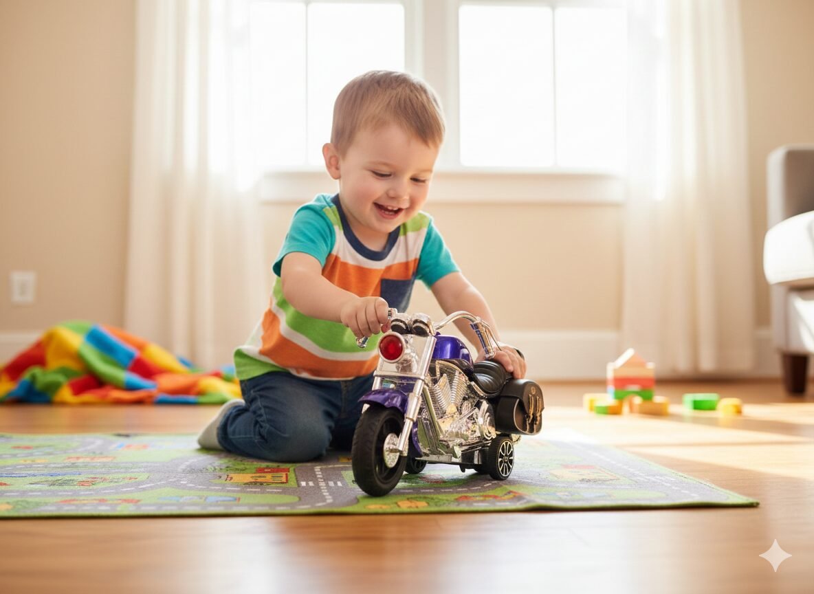 Para los pequeños rebeldes que sueñan con la carretera abierta. Esta moto tiene todo el cromo y el brillo de una clásica de verdad.