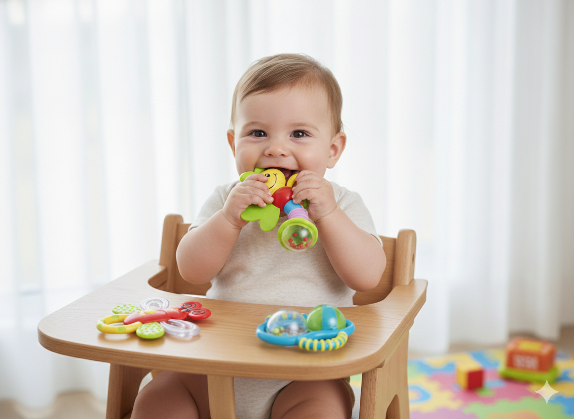 Contenido: Incluye tres piezas con formas amigables: una abeja colorida, una flor con texturas y un sonajero circular con cuentas internas.