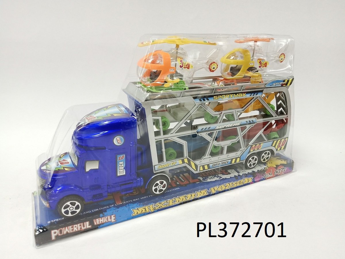 ¿Por qué llevar un solo vehículo cuando puedes llevar a todo el equipo? Este impresionante camión transportador en azul metálico es una base de operaciones móvil. En su plataforma de dos niveles transporta coches deportivos y dos helicópteros de rescate listos para despegar. ¡La diversión no tiene límites cuando tienes aire y tierra cubiertos!