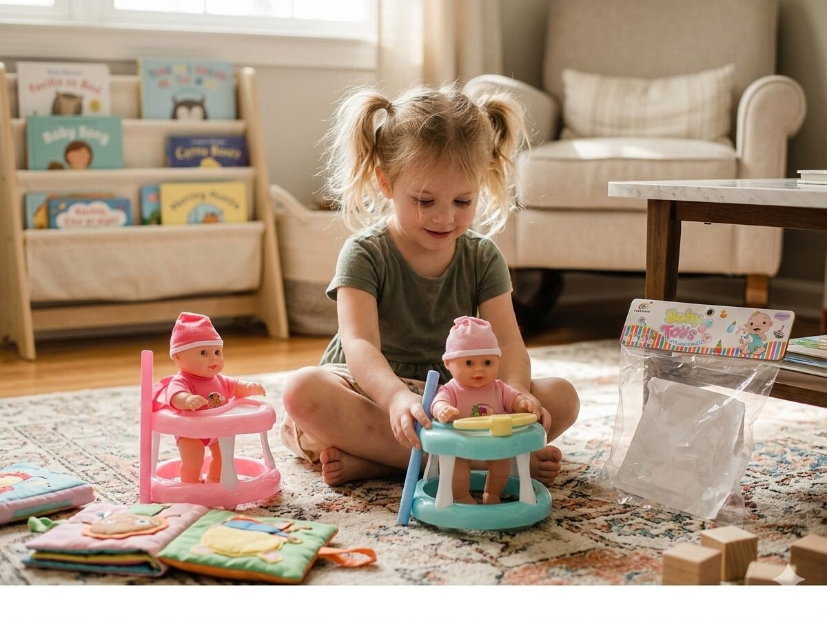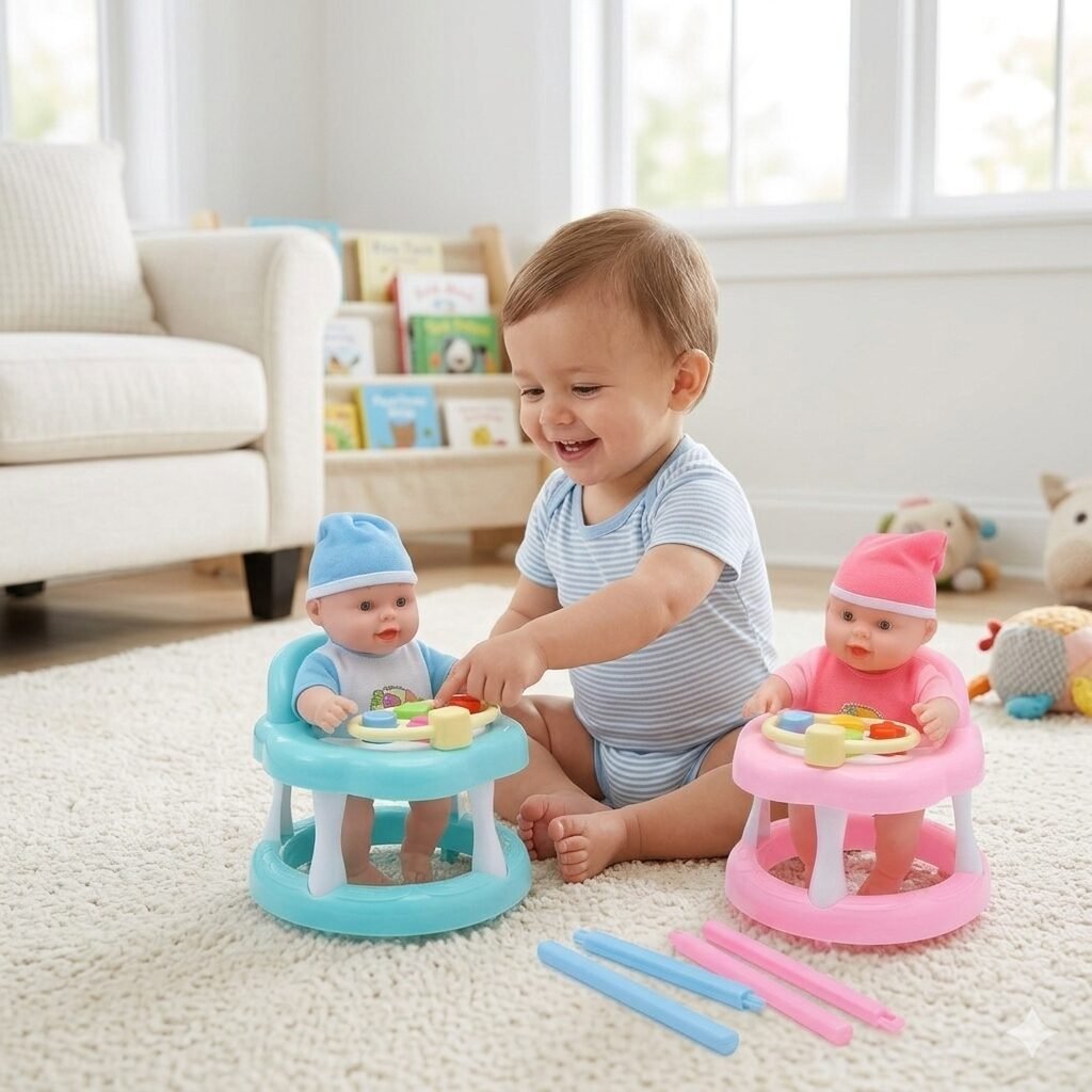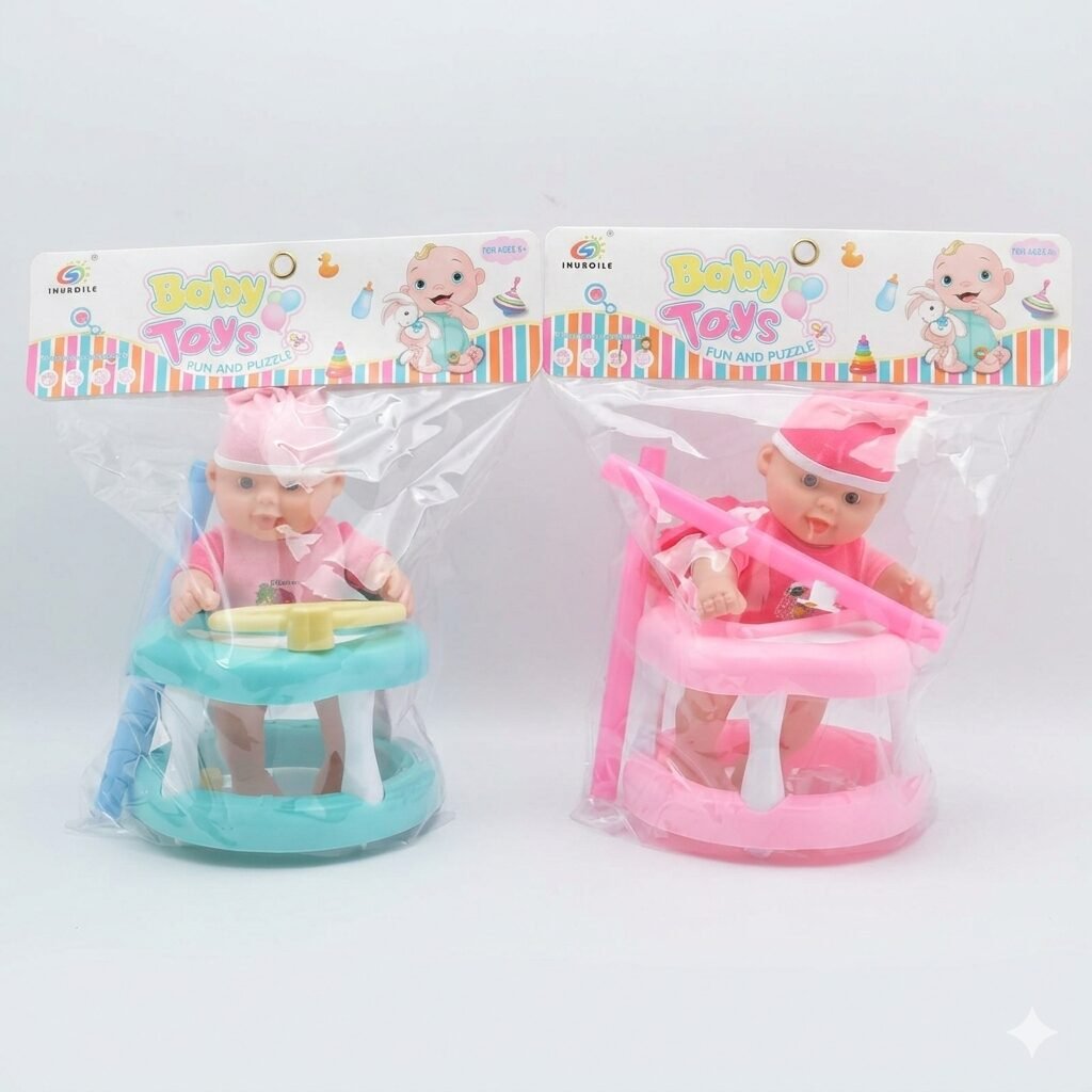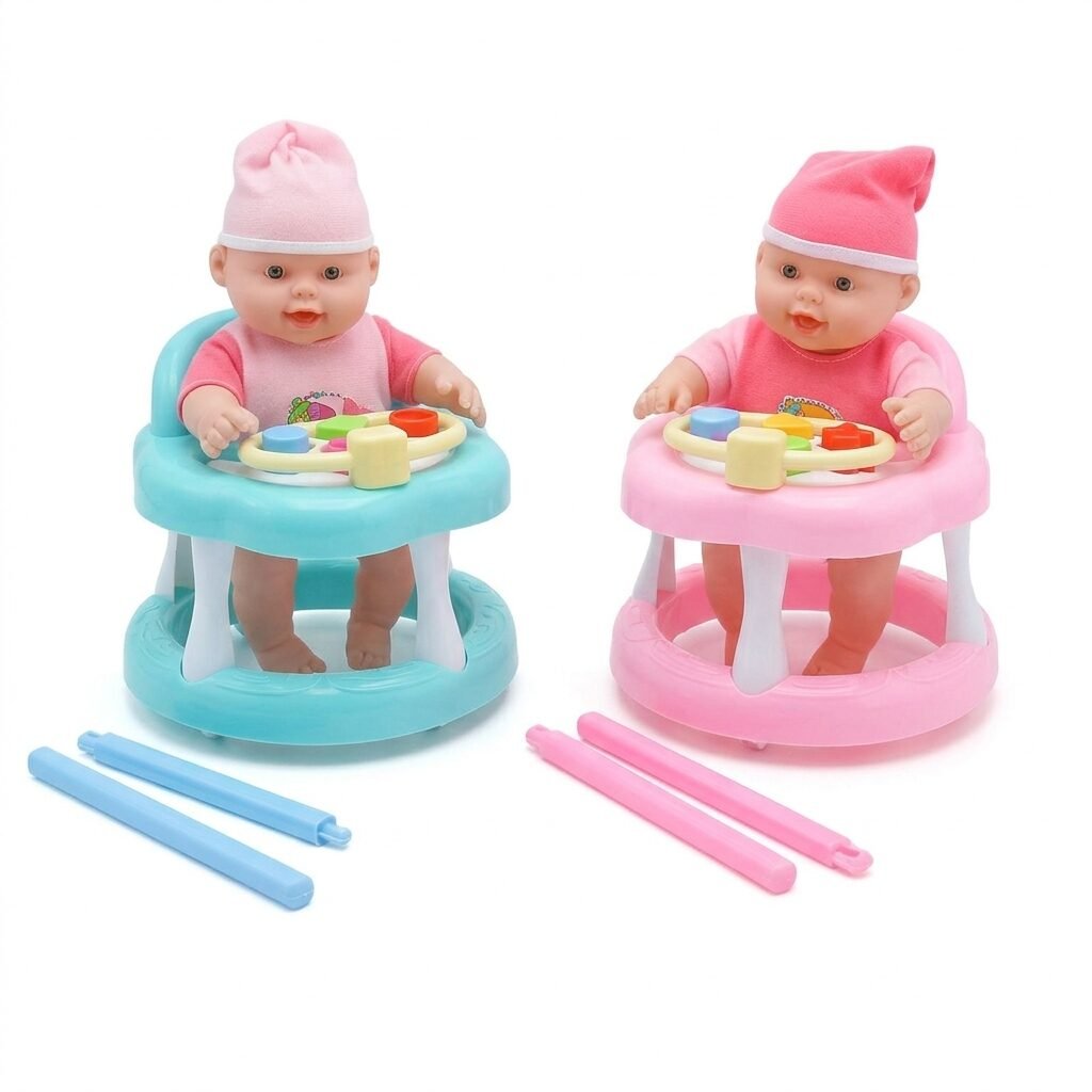 Título: Baby Toys: ¡Diversión en el Andador! Un tierno set de muñecos bebé en sus andadores de colores. Perfectos para los más pequeños de la casa que están empezando a imaginar mundos y cuidar de sus propios «bebés». Vienen listos para jugar y con todo el encanto de un juguete clásico que nunca pasa de moda.