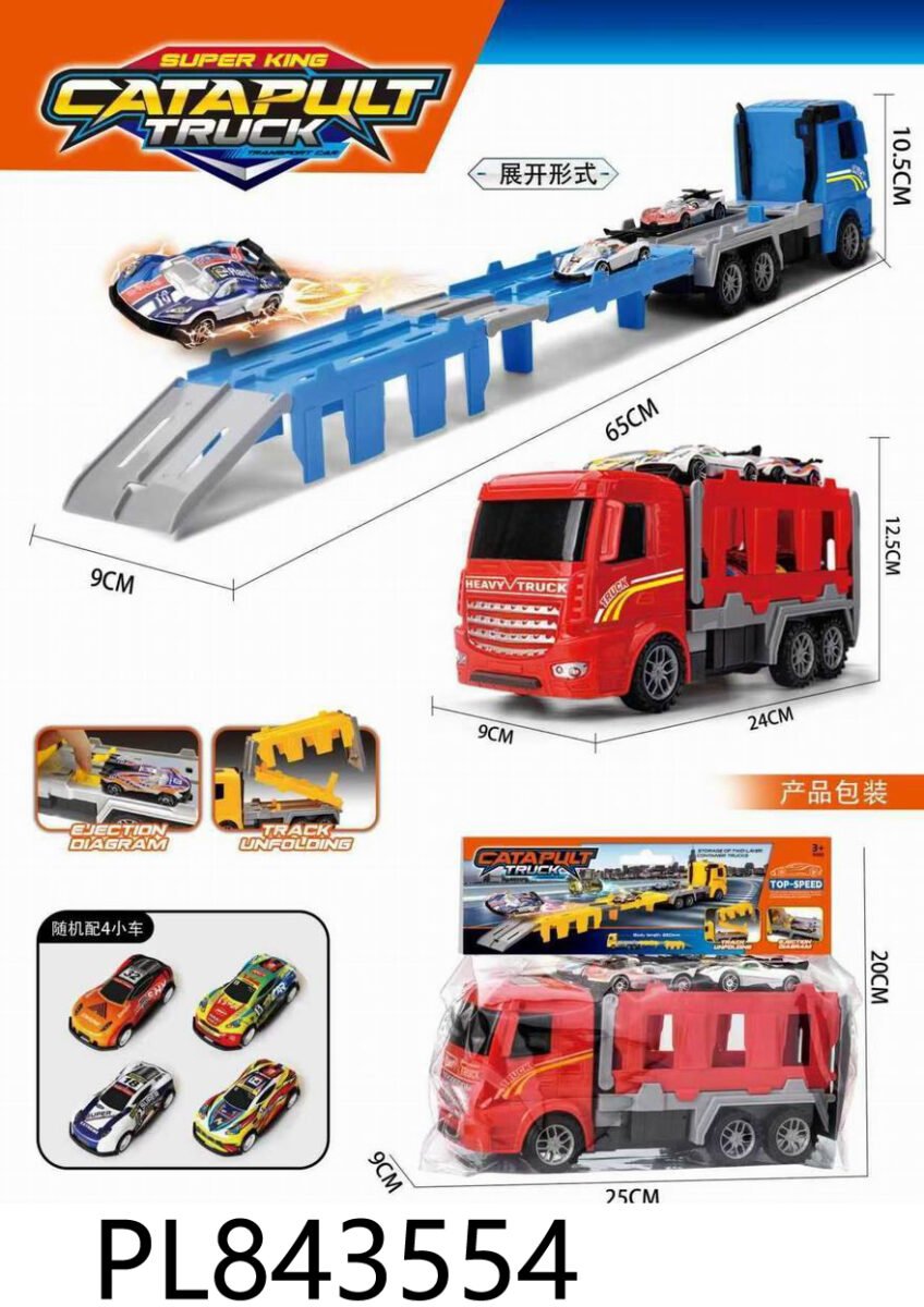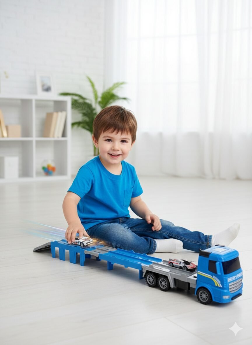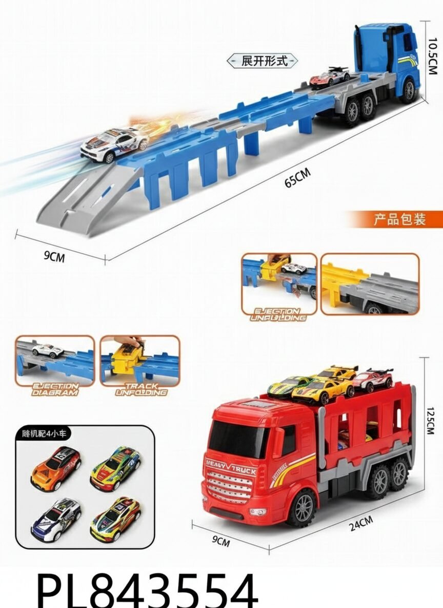 Más que un transporte, es una pista de lanzamiento móvil. Este innovador camión rojo de carga pesada esconde un secreto: su remolque se despliega para transformarse en una extensa pista de 65 cm con catapulta integrada. Coloca tus autos, activa el mecanismo de eyección y mira cómo salen disparados hacia la victoria.