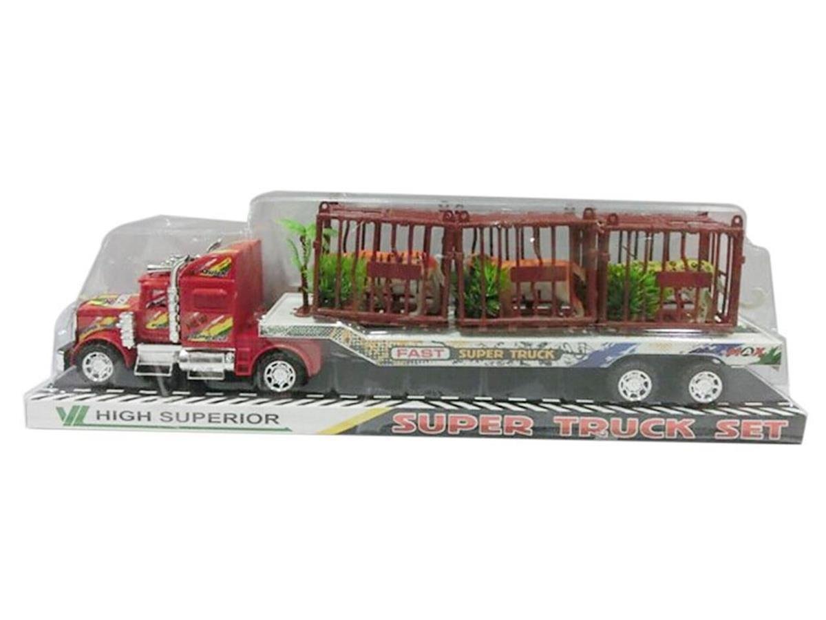 Contenido: 1 Tractocamión, 1 remolque de plataforma, 3 jaulas con animales y follaje decorativo.
