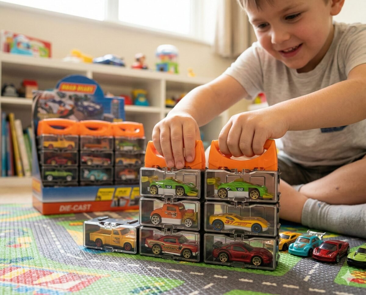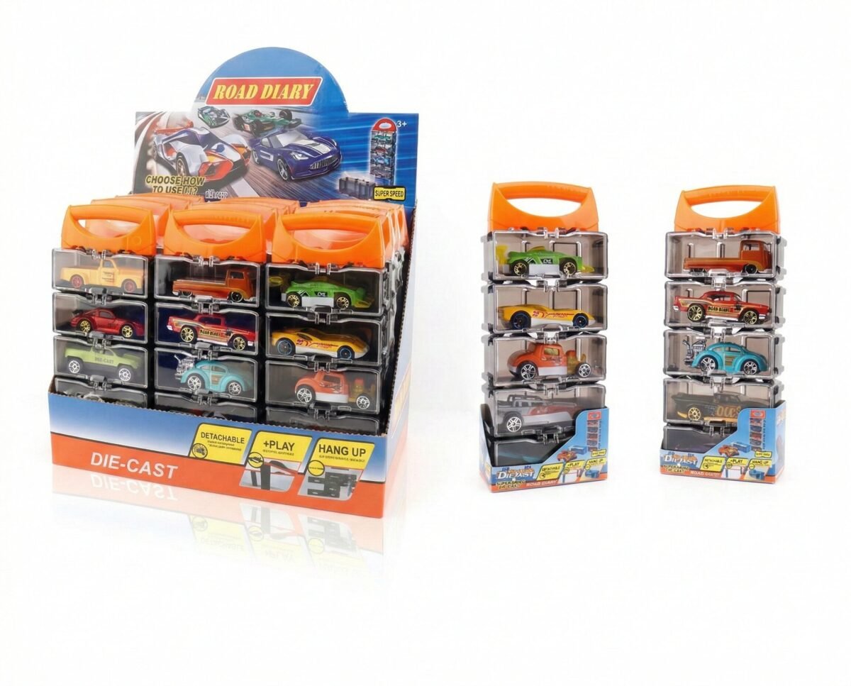 Título: Road Diary: ¡Tu Colección a Todas Partes! ¿Cansado de encontrar cochecitos debajo del sofá? El set «Road Diary» es la solución con estilo. Son torres de exhibición individuales que puedes separar, conectar o incluso colgar en la pared. Cada torre viene con 4 vehículos metálicos (Die-Cast) listos para la acción. Es el regalo perfecto para el coleccionista que quiere presumir su flota de forma ordenada. ¡Desconecta un módulo y llévate la carrera al parque!