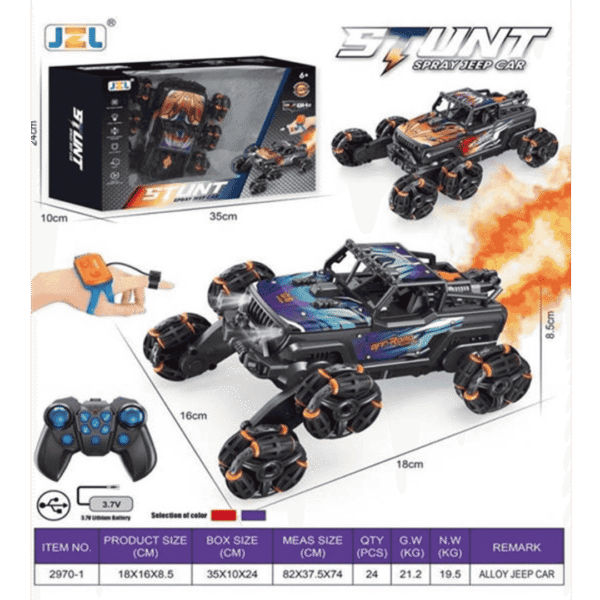 El Stunt Spray Jeep Car 2970-1 es un vehículo acrobático 4×4 de alto rendimiento con efecto de vapor simulando escape, luces LED y control por movimiento manual. Diseñado para ofrecer una experiencia de conducción única, combina tecnología avanzada, diseño agresivo y diversión sin límites.