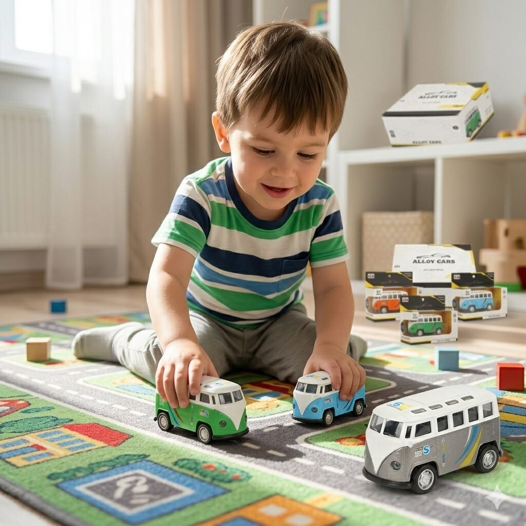 Título: Alloy Cars: El Tour de la Diversión Estas no son unas furgonetas cualquiera; son pequeñas joyas de metal con mucha personalidad. Disponibles en cuatro colores vibrantes (verde, naranja, azul y gris), estos mini buses cuentan con música y luz para que cada viaje sea una fiesta. Tienen un mecanismo de retroimpulso (pull-back): solo tira hacia atrás, suelta y mira cómo salen disparadas hacia la próxima aventura retro.