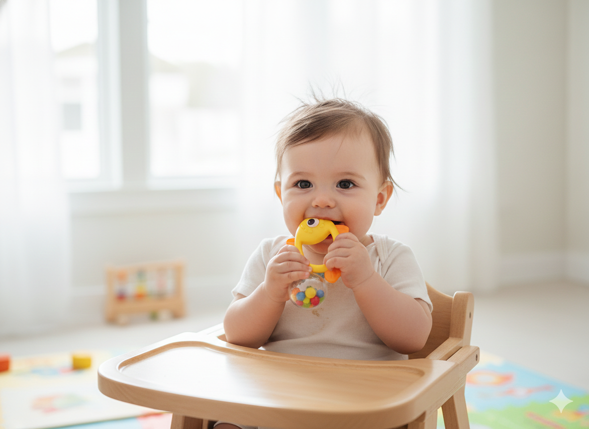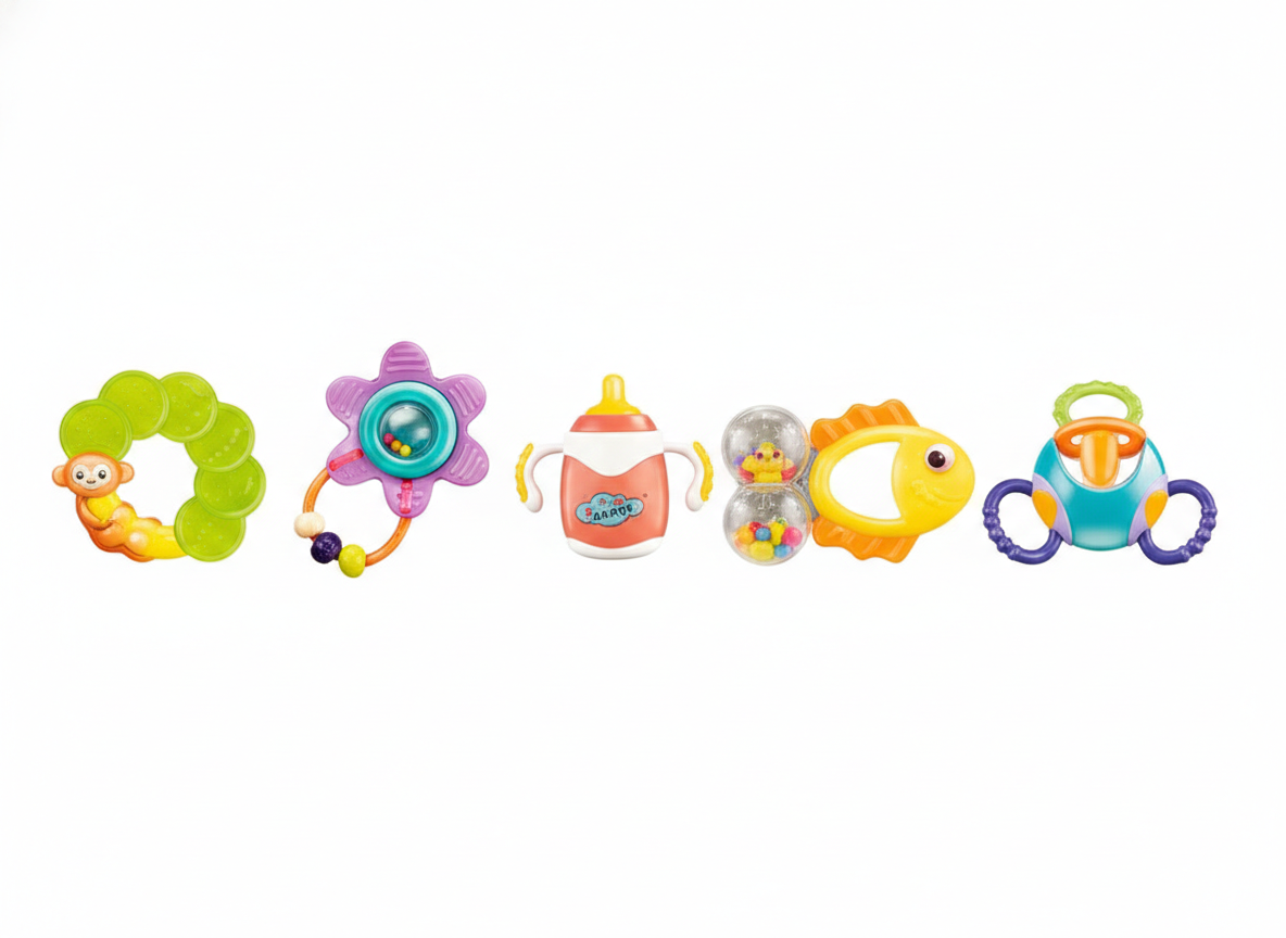 Contenido: Mordedores con formas de animales (mono, pez) y sonajeros de diferentes texturas.