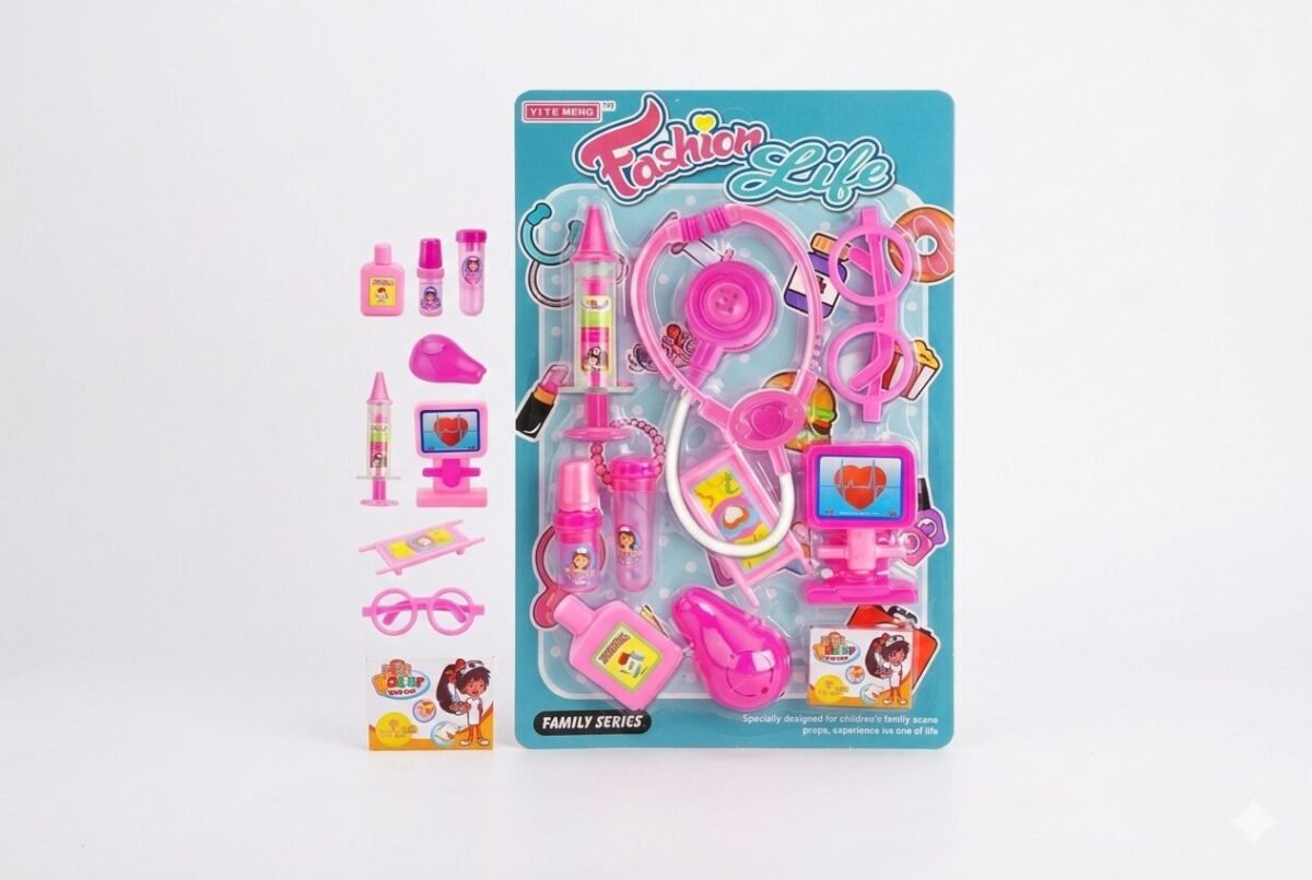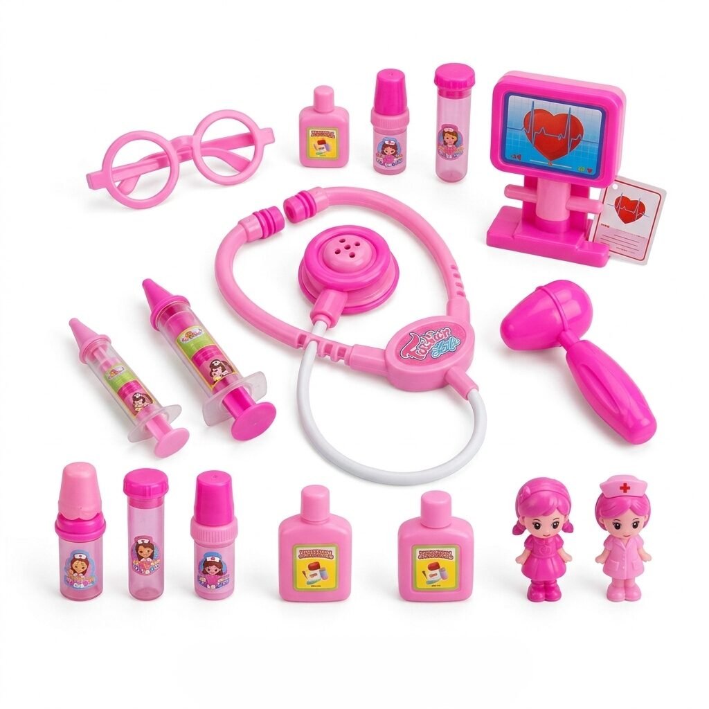 Descripción: ¿Un peluche con fiebre de purpurina? ¿Una muñeca con dolor de peinado? ¡No hay problema! Con este kit médico rosa neón, las consultas son pura moda. Incluye estetoscopio, gafas de «intelectual» y hasta un monitor cardíaco para asegurar que el corazón de sus juguetes late con mucho ritmo.