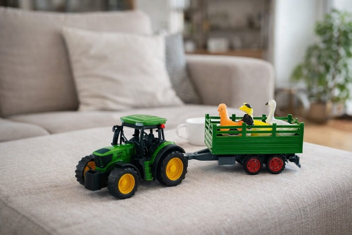 Tractor de granja con remolque incluido, diseñado para niños que disfrutan el juego creativo y los juguetes agrícolas. Incluye figuras de animales para recrear escenas de granja, ayudando a estimular la imaginación y la motricidad.