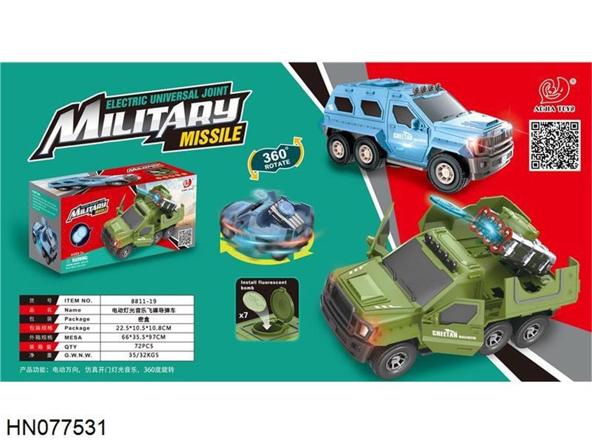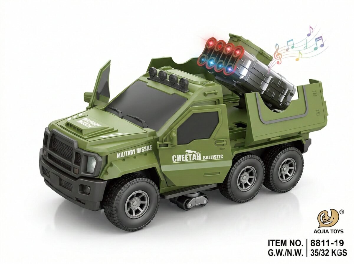 Descripción: ¡Atención, pelotón! Este vehículo militar no se detiene ante nada. Tiene ruedas universales (se mueve para todos lados), luces de combate y una plataforma de misiles que gira 360 grados. La victoria está asegurada en cualquier terreno de juego.