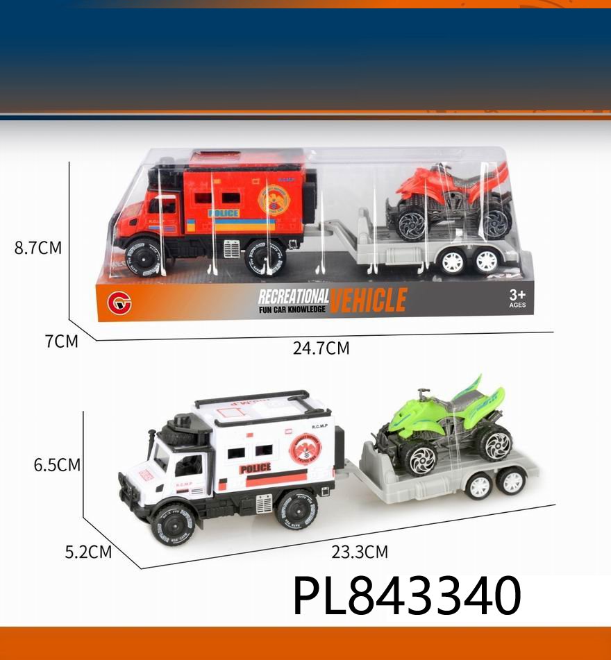 • Contenido: Set de dos piezas (camión + remolque con vehículo).