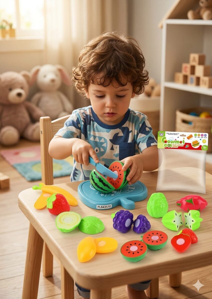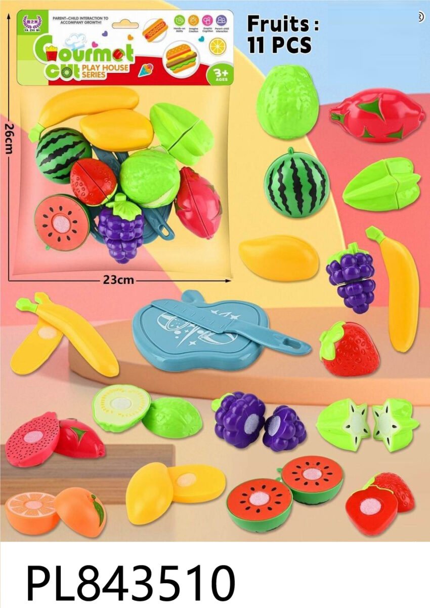 Lo que importa: 11 piezas que incluyen frutas tropicales, tabla de picar y cuchillo. Las frutas se separan para una experiencia de «corte» súper realista.
