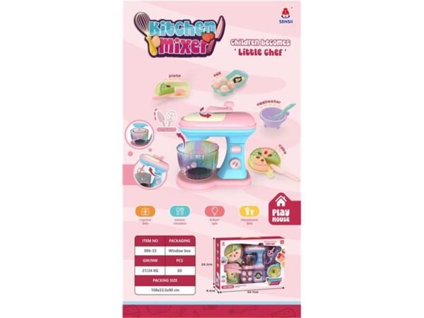 Este juguete de cocina simula una batidora de repostería y está diseñado para que los niños y niñas disfruten jugando a ser chefs. El set incluye varios accesorios relacionados con la cocina y la pastelería, fomentando el juego de roles y la imaginación.