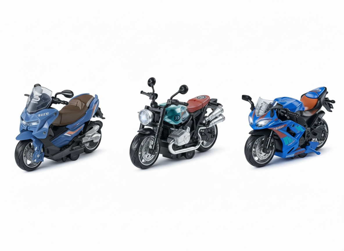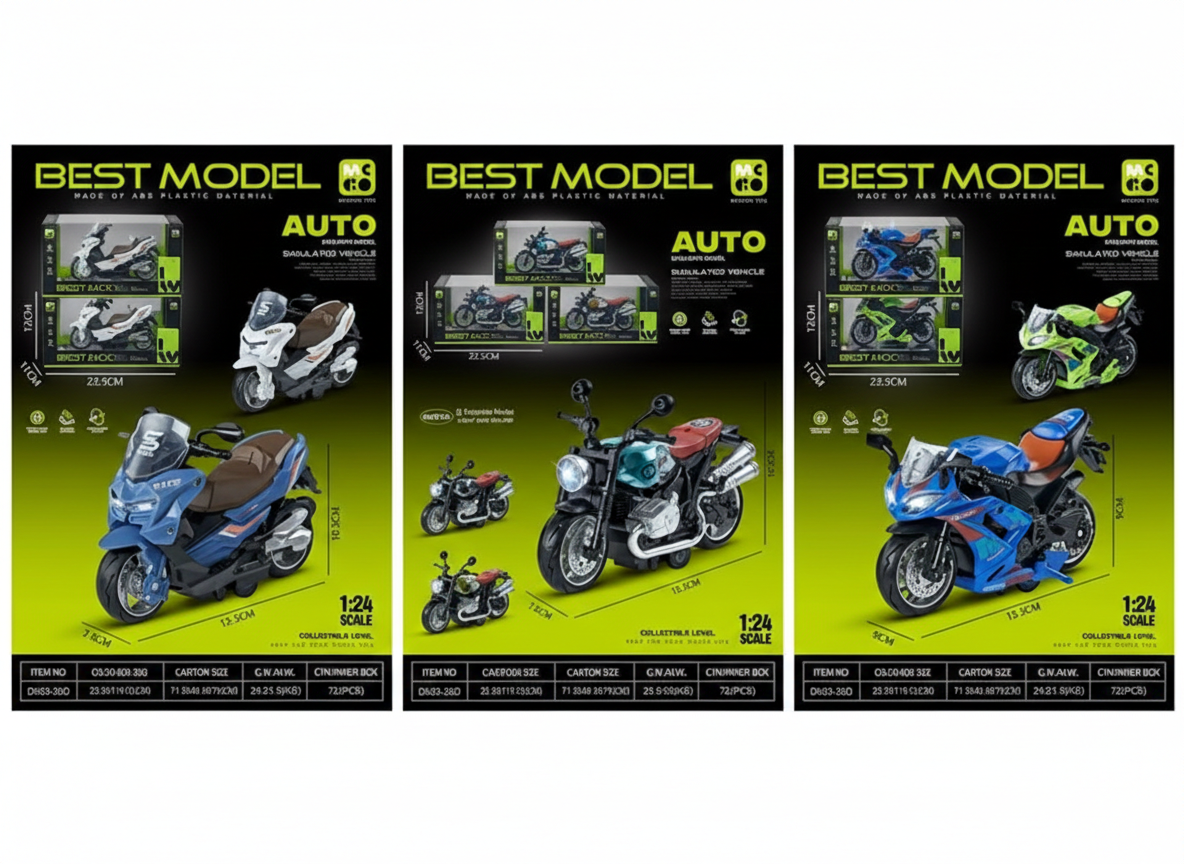 Descripción: Una pieza de exhibición que también sabe correr. Con una escala de 1:24, estas motocicletas capturan la esencia de las máquinas de carreras reales. Detalles en el motor, neumáticos de goma y colores metálicos que las hacen resaltar en cualquier repisa o pista de juegos. ¡Es el regalo ideal para los apasionados de la velocidad!