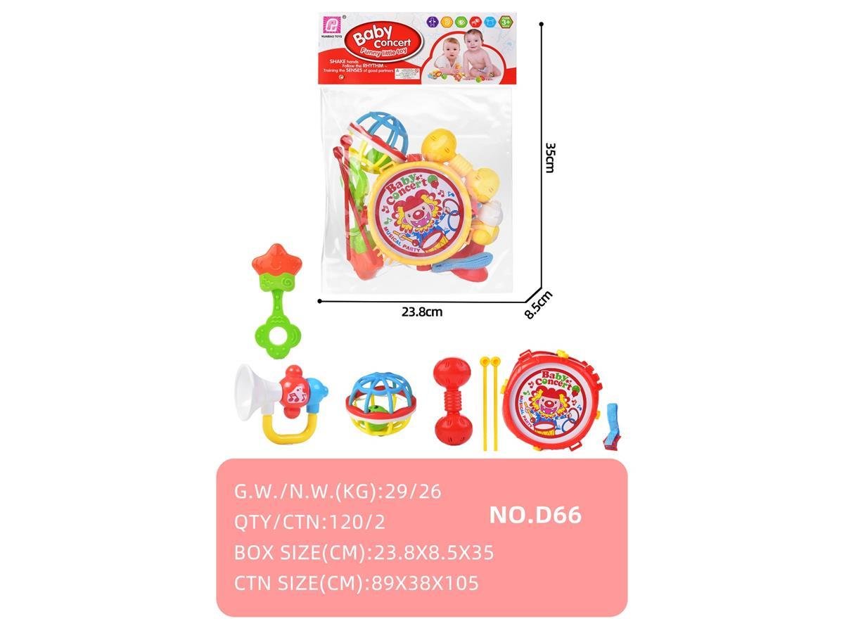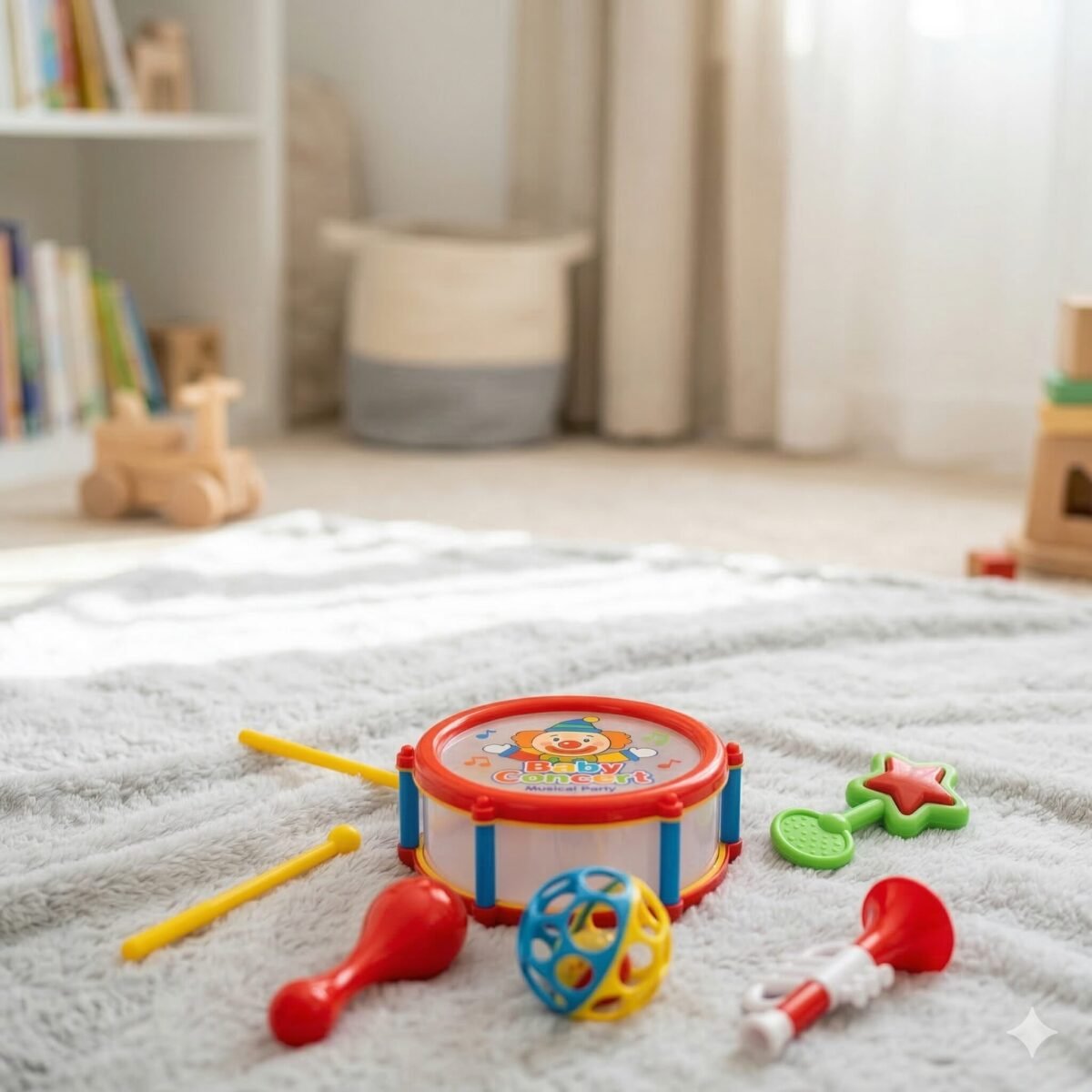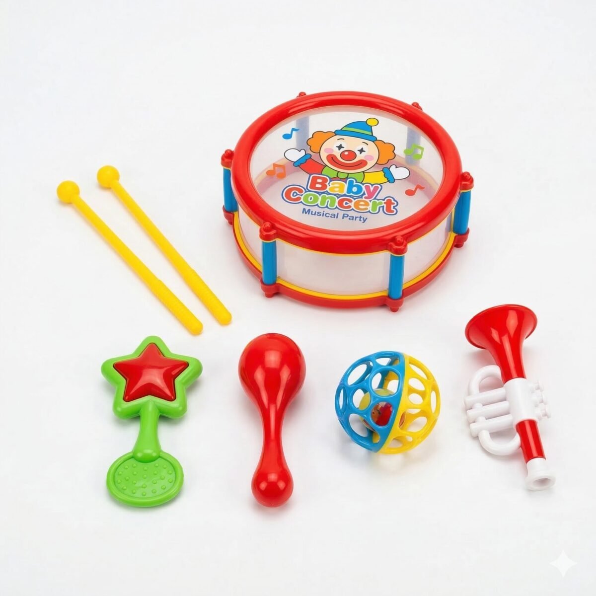 Lo que importa: Set musical de 7 piezas que incluye tambor, baquetas, trompeta, maracas y sonajas. Colores vibrantes y bordes redondeados para máxima seguridad sonora.