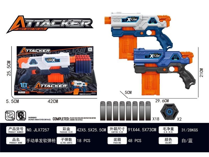 Prepárate para la acción con este increíble bláster de dardos de espuma Attacker, diseñado para ofrecer precisión, potencia y horas de diversión. Ideal para juegos en equipo, competencias en casa o batallas al aire libre.
