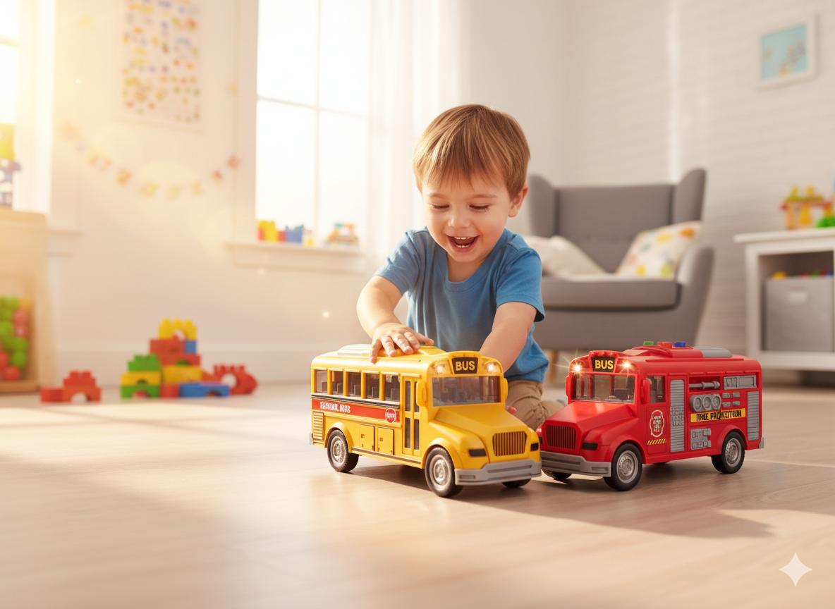 Modelos: Clásico Autobús Escolar amarillo y Camión de Protección contra Incendios rojo.