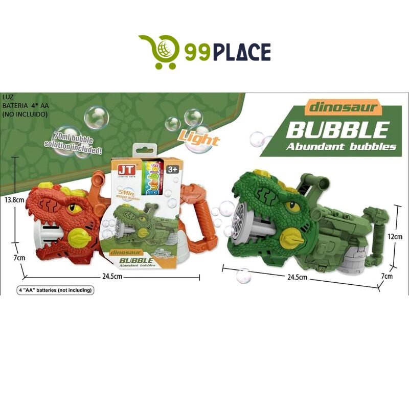 Divertida pistola automática de burbujas con diseño de dinosaurio, ideal para fiestas, eventos y juegos al aire libre. Produce abundantes burbujas mientras emite luz, creando un efecto llamativo y entretenido para los niños.