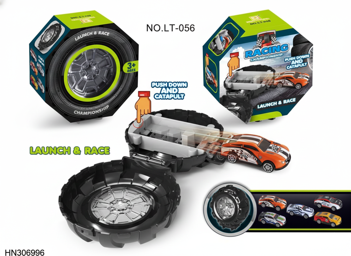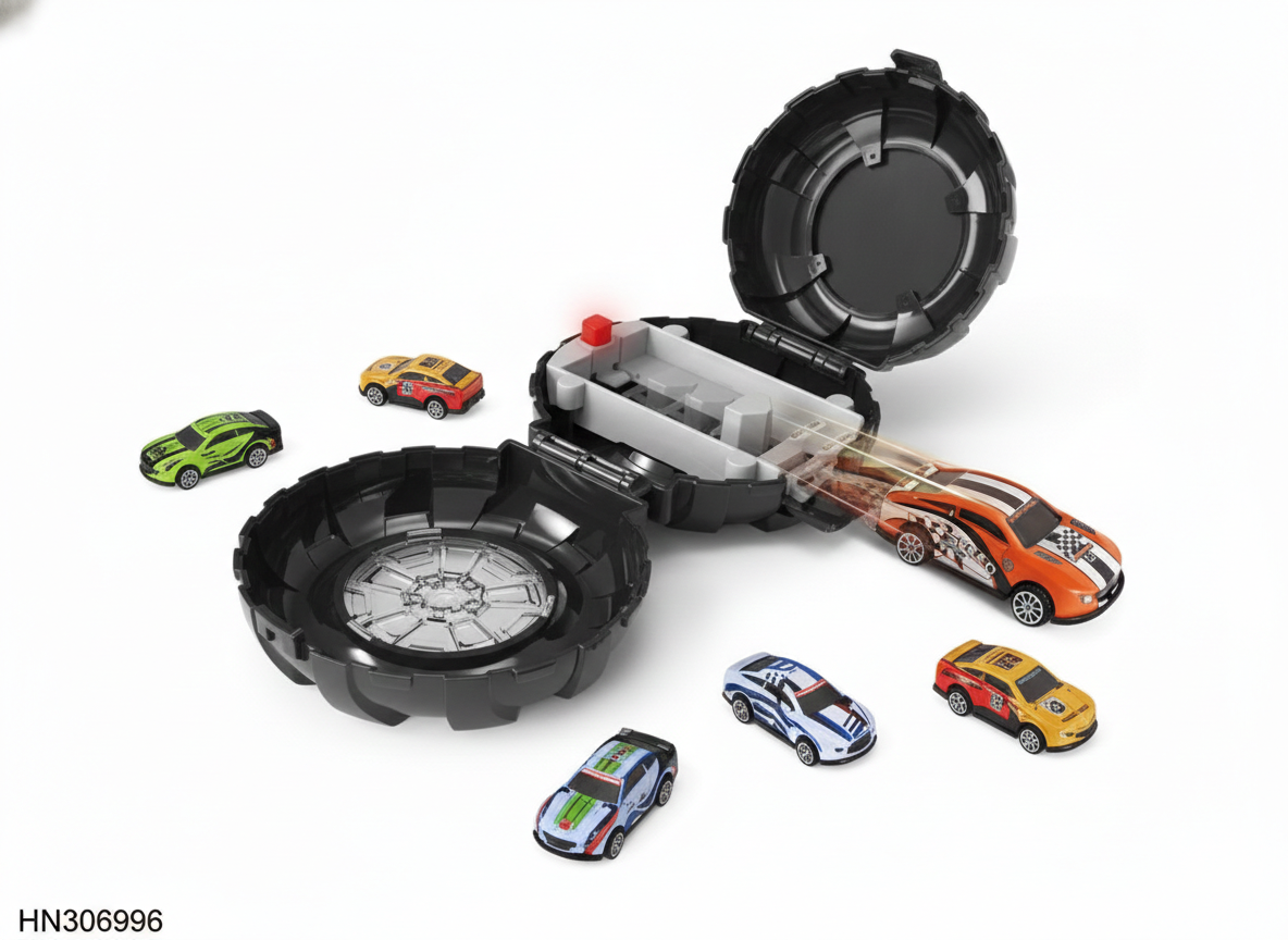 Diseño funcional: El empaque circular con forma de neumático funciona como pista de lanzamiento y como caja para guardar la colección de micro autos.