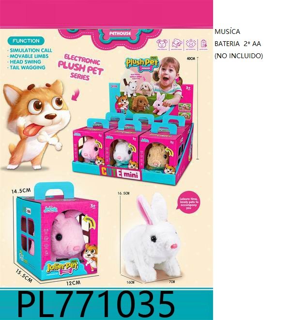 Tierna mascota electrónica de peluche en forma de conejito, diseñada para entretener y acompañar a los niños. Este adorable juguete interactivo reproduce música y realiza movimientos, fomentando el juego imaginativo y la diversión.