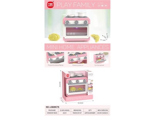 El Mini Horno de Juguete LS820C76 es parte de la línea Play Family de Mei Lian Sheng, diseñada para que los niños disfruten horas de juego creativo mientras imitan las tareas del hogar. Con su diseño moderno en color rosa pastel, luces reales y sonidos interactivos, los pequeños se sentirán como verdaderos chefs.