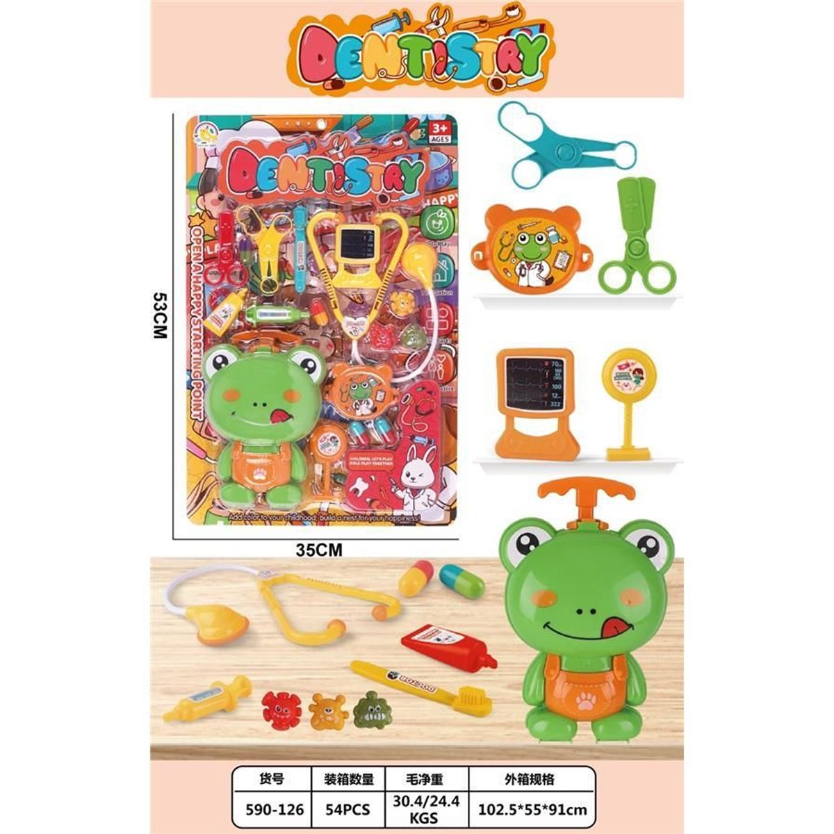 ¡Ayuda a tu pequeño a superar el miedo al dentista con este adorable set! Viene en un estuche con forma de rana, que contiene herramientas de dentista y médico (como un estetoscopio y pinzas). Es perfecto para el juego de roles de médico y ayuda a los niños a entender la importancia del cuidado dental y a desarrollar empatía y habilidades sociales al «tratar» a sus pacientes.