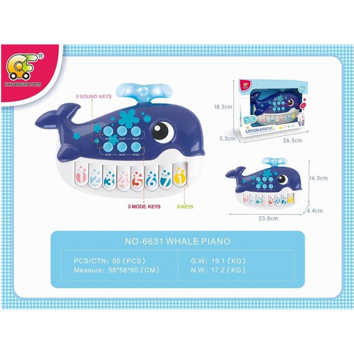 El Whale Piano No. 6631 es un juguete musical educativo diseñado para bebés y niños pequeños. Con su adorable forma de ballena, colores vibrantes y múltiples funciones de sonido, este piano ofrece horas de diversión mientras estimula el aprendizaje temprano.