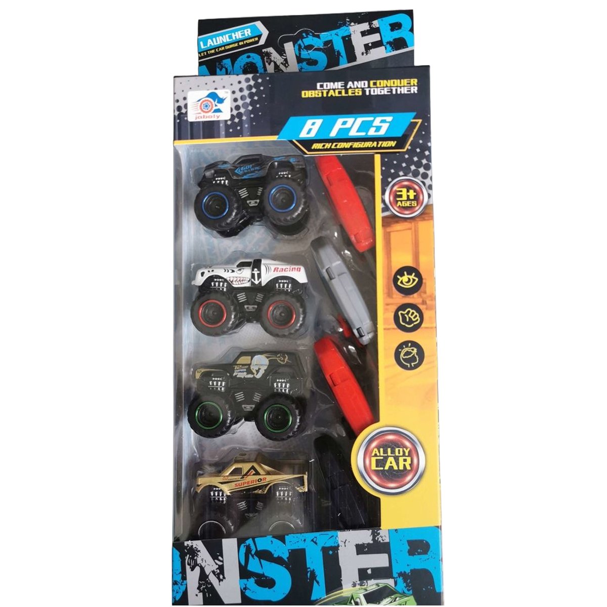 • 8 Camiones de Aleación (Alloy Car): El set incluye 4 diseños de Monster Trucks en diferentes colores (negro, blanco/negro, negro/verde y dorado/negro), con ruedas extragrandes para superar cualquier obstáculo imaginario.