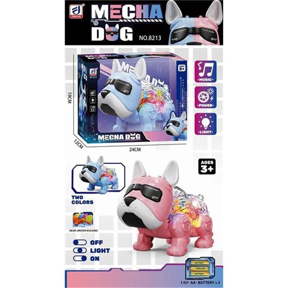 Descripción: Conoce a la mascota robótica más genial de la ciudad, el «Mecha Dog». Este adorable Bulldog Francés futurista viene en dos colores modernos (rosa y azul/blanco) y cobra vida con música, luces y una marcha impulsada por engranajes. ¡Un compañero mecánico perfecto que enseña a los niños sobre causa y efecto de una manera divertida y futurista!
