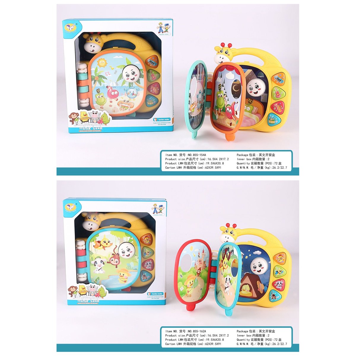 Pantalla Plegable: La parte central se abre para revelar un espejo de seguridad o un fondo temático (animales, naturaleza) y figuras flotantes que se mueven.