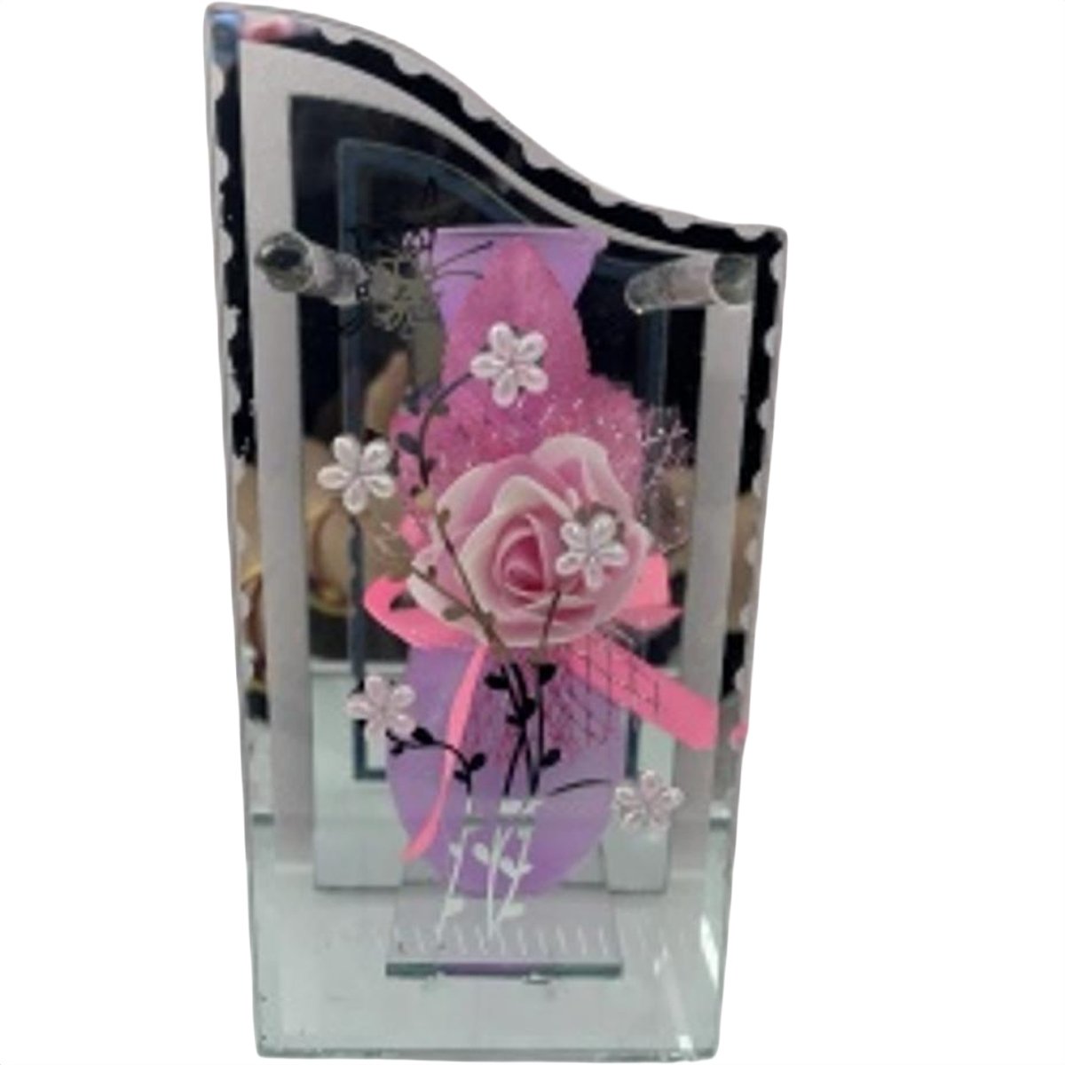 Panel de Cristal Curvo con Rosa Central. Un elegante panel de vidrio con corte superior ondulado. El diseño impreso muestra una rosa en tonos pastel rodeada de pequeñas flores blancas en relieve.