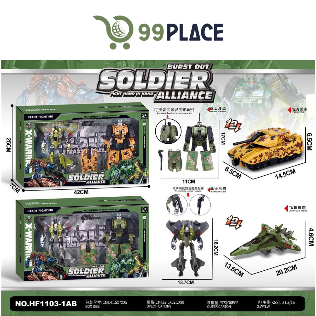 Cada robot puede convertirse en vehículo militar: uno en tanque blindado y otro en avión de combate, lo que ofrece una experiencia 2 en 1 llena de dinamismo. Además, las figuras cuentan con articulaciones móviles, detalles tácticos y partes intercambiables para recrear escenas de combate o misiones estratégicas.