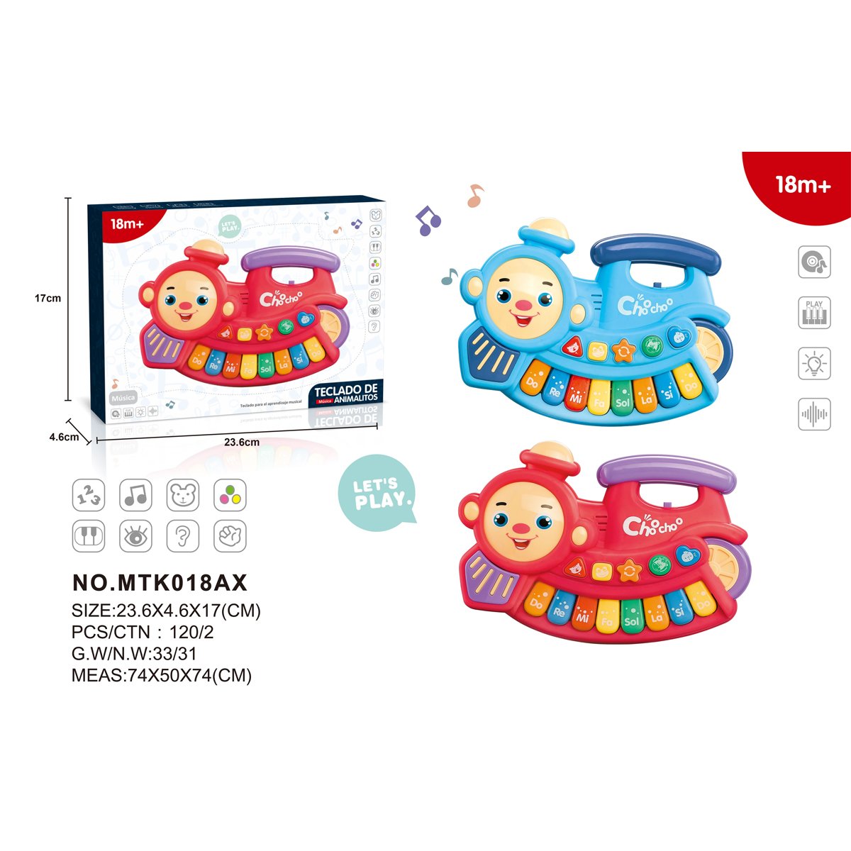 ¡Sube a bordo del tren musical! Este divertido Teclado de Animalitos con diseño de locomotora es perfecto para la introducción musical de los más pequeños. Cuenta con teclas de piano de colores brillantes que enseñan las notas musicales básicas (Do, Re, Mi, etc.). Su diseño amigable y sus funciones de sonido estimulan el desarrollo auditivo y la coordinación mano-ojo.