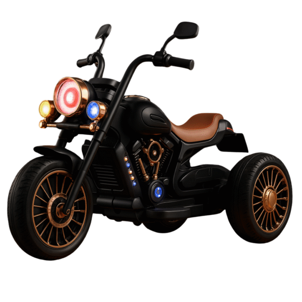 Prepárate para ver a tu peque arrancar motores con estilo. Esta increíble moto eléctrica tipo Harley de tres ruedas combina diseño, potencia y diversión a todo color. Su look negro con detalles verdes y luces LED multicolores la hacen parecer salida de una película futurista (¡y sí, roba miradas dondequiera que pasa!).