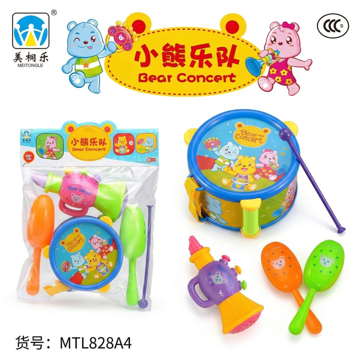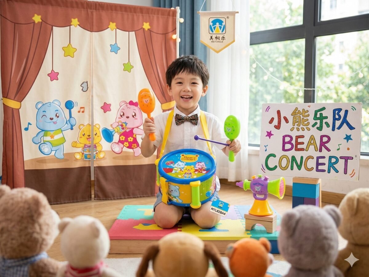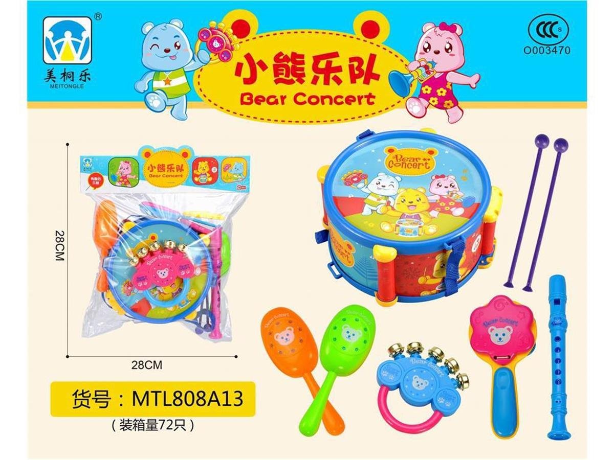 Descripción: ¿Tienes un Mozart en potencia en casa? Este set musical tiene todo lo necesario para un concierto inolvidable en la sala. Tambor, pandereta, flauta y maracas; básicamente, el kit completo para que tus vecinos sepan que hay talento en tu hogar. Con diseños de ositos adorables, es la forma más divertida de despertar el ritmo y la coordinación.