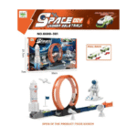 Incluye un vehículo con mecanismo pull back para lanzarlo a toda velocidad, un loop gigante para acrobacias, un cohete espacial y figuras temáticas como un astronauta y antenas satelitales.