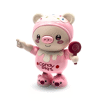 • 🍭 ¡Y todo con un look dulce, con su paleta en mano y orejitas adorables!
