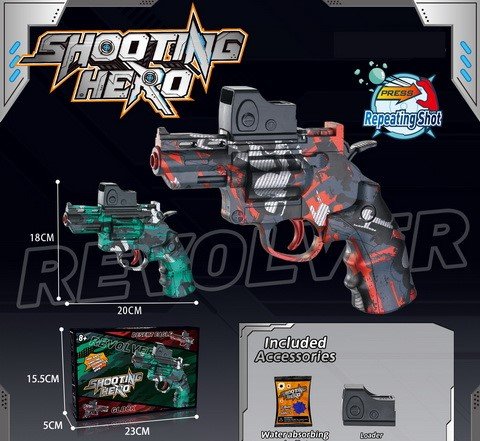 ¡Prepárate para una batalla épica de precisión, puntería y acción acuática! Con este increíble Revolver Shooting Hero, los pequeños (y no tan pequeños) podrán liberar su energía al estilo héroe táctico con una pistola moderna, resistente y totalmente divertida.