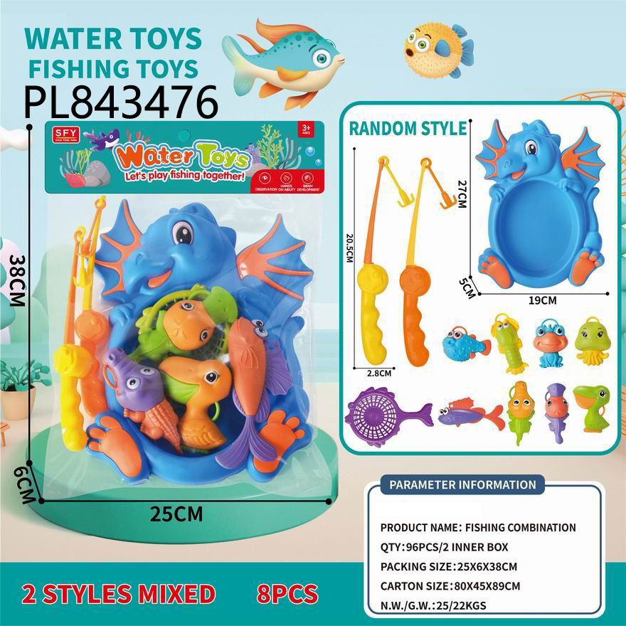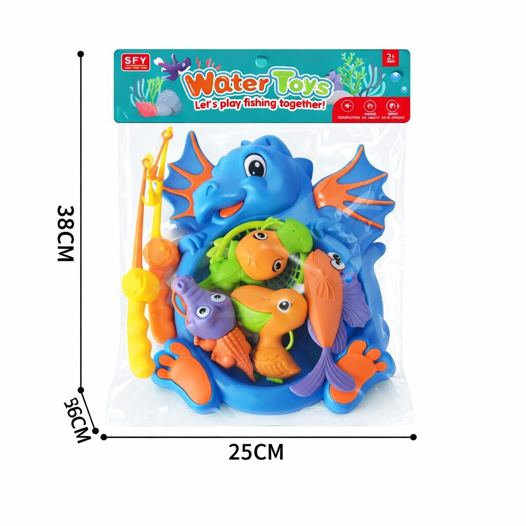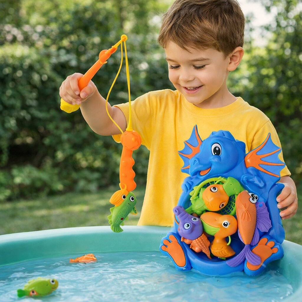 Descripción: ¡La hora del baño se convierte en un océano de aventuras! Este set de pesca incluye un simpático recipiente en forma de dragón y coloridos pecesitos. Usa las cañas de pescar para atrapar a los amigos marinos mientras chapoteas. ¡El que pesque más, gana!