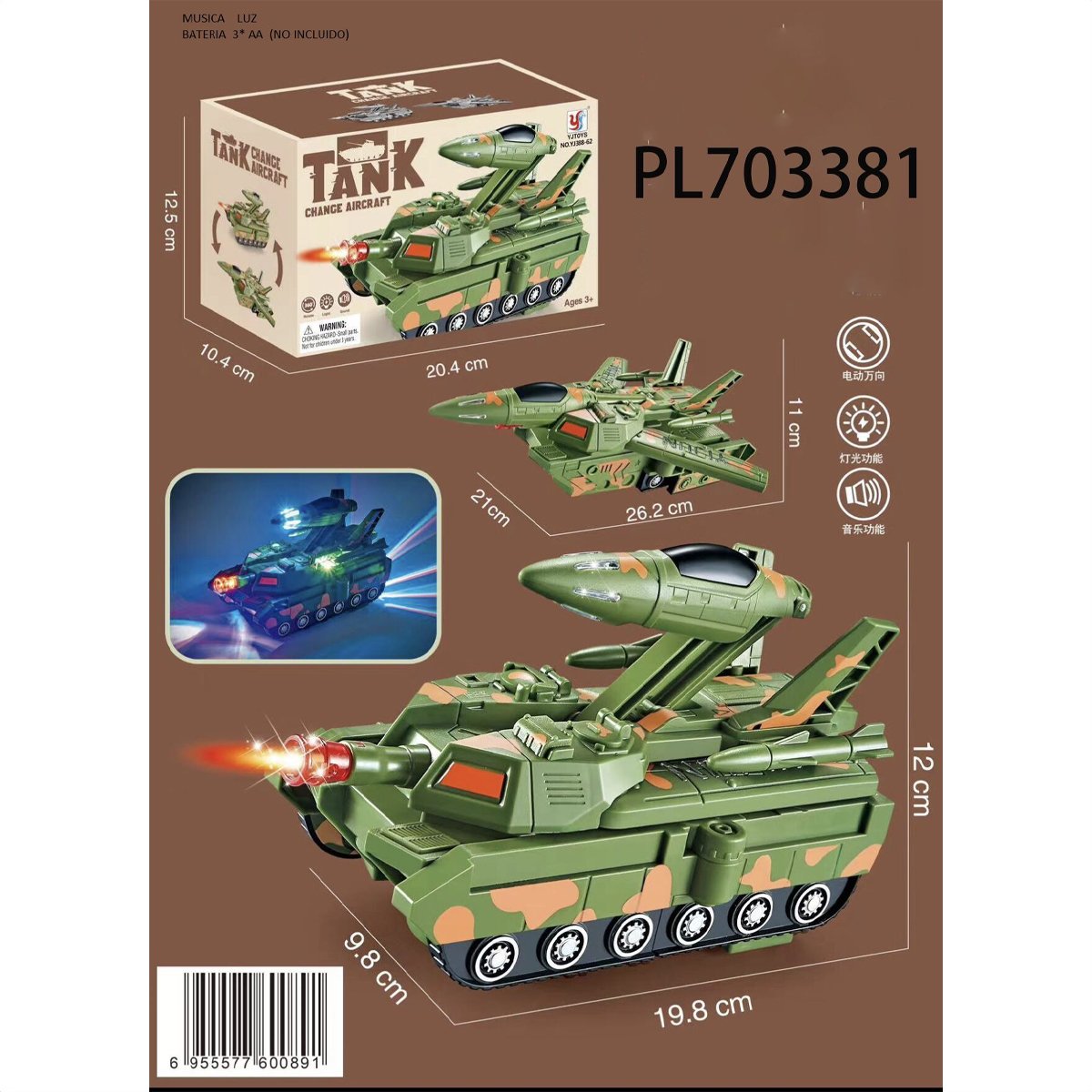 ¡Prepárate para la batalla más épica del universo juguetero! Este tanque militar camuflado no solo ruge con luces y sonido… ¡también se transforma automáticamente en un jet de combate supersónico! 🌪️✈️