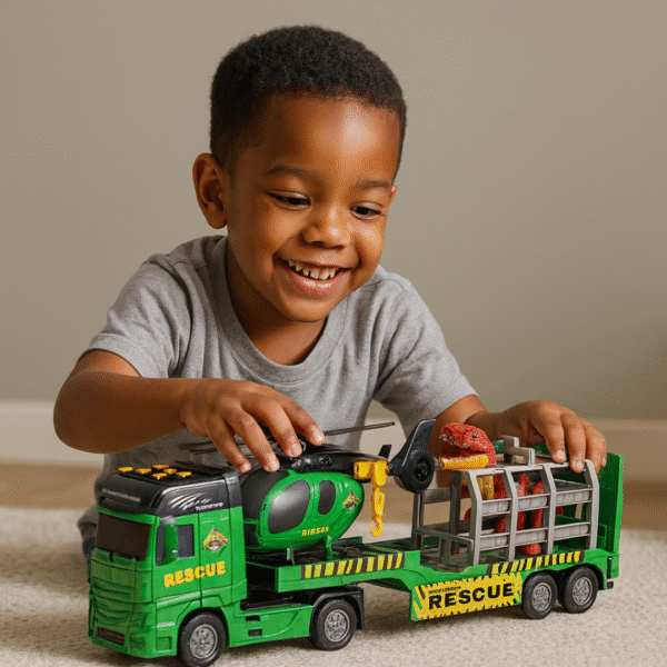 ¡Alerta en la jungla! Un dinosaurio ha sido capturado y solo tu equipo de rescate puede trasladarlo a salvo. Este camión de rescate animal con helicóptero incluido es el juguete perfecto para los pequeños exploradores que aman los dinosaurios, las misiones de rescate y la acción sin fin. 🌿🛻🚁